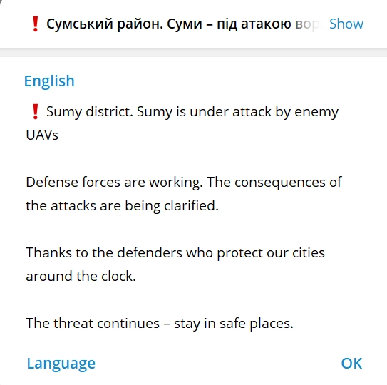 A administração militar regional de Sumy postou avisos para procurar abrigo no telegrama.