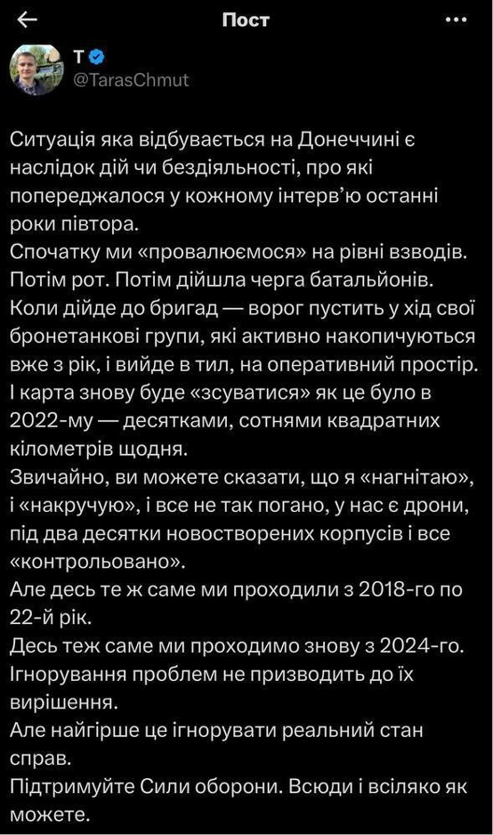 O oficial aposentado do exército ucraniano Bohdan Krotevych, ex -oficial sênior do 1º Corpo da Ucrânia “Azov”, em uma carta aberta no final da segunda -feira ao presidente ucraniano Volodymyr Zelensky postou em seu canal “X”, atacou a liderança do exército, e que ele disse que eram uma semana de alertas por soldados no campo do campo criticamente curto de Manyning, e que ele dizia que ele disse que foram as semanas de sinalizações por sinalizadores do campo de defesa do campo de defesa do campo de defesa do campo de defesa do campo criticamente curto de Todo o Pokrovsk Saliente.