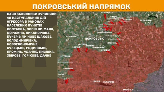 Uma atualização da situação de terça -feira, publicada pela Joint Forces Dnipro (JFD), a sede regional ucraniana responsável pelo setor de Pokrovsk, disse que as forças russas atacaram nas proximidades de Dobropillia e as aldeias vizinhas de Poltavka, nove Shakhove, Zapovedne, Kucheriv Yar, Yary Yary. Todos foram repelidos, disse esse comunicado.