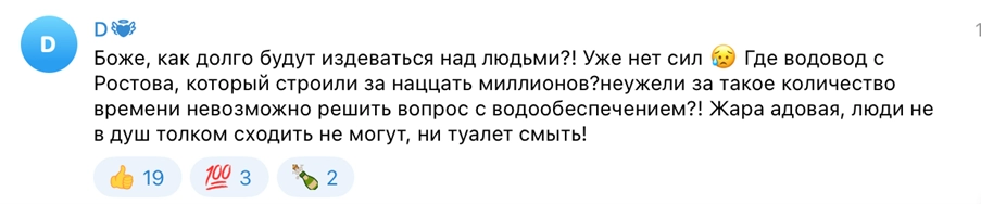 Na seção de comentários em Outra publicação Nesse canal, uma mulher local reclamou: “Deus, por quanto tempo eles continuarão atormentando pessoas assim?! Não temos força restante. Onde está o oleoduto de Rostov em que eles gastaram milhões? É realmente impossível resolver o problema de abastecimento de água depois de todo esse tempo?! O calor é insuportável – as pessoas não conseguem nem tomar um banho adequado ou lavar o banheiro adequado.”