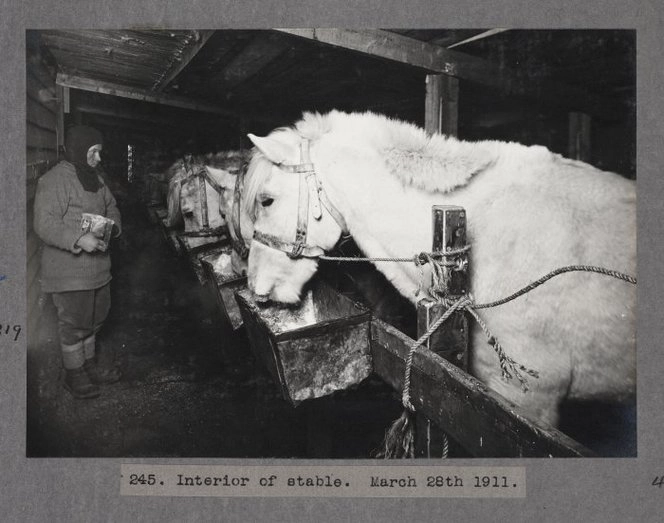 “Anton … completou o mobiliário dos estábulos. Barracas arrumadas ocupavam todo o comprimento do ‘magro’ … havia um amplo espaço para o porto seguro dos 10 bestas que permanecem, seja o inverno nunca tão frio ou os ventos tão selvagens”, comentou Scott em seu diário logo após o desembarque na Antártica.